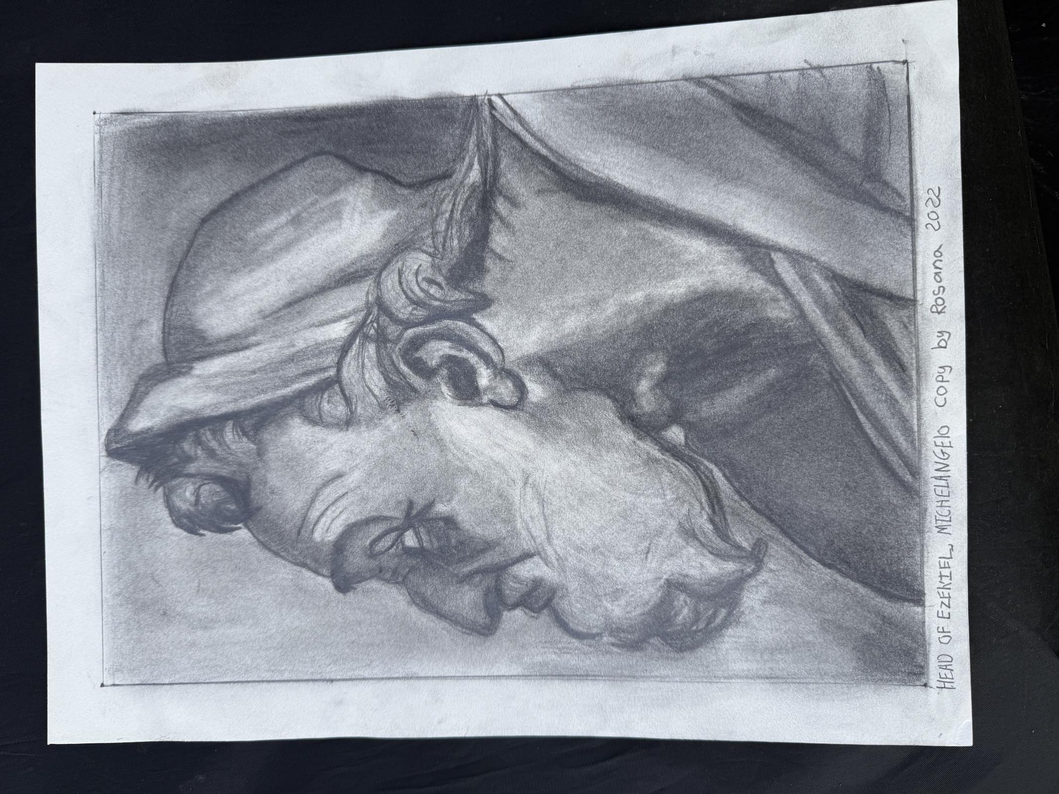 This drawing is a faithful yet personal study of the head of the Prophet Ezekiel from Michelangelo's Sistine Chapel ceiling fresco (c. 1510), one of the High Renaissance master's most commanding prophetic figures. In profile, the aged prophet turns dynamically as if startled by divine revelation, his intense gaze fixed upward. Michelangelo captured Ezekiel's wisdom and urgency through deep-set eyes beneath a furrowed brow, a flowing beard, prominent ear, and turban-like headdress—elements rendered here with rich tonal contrasts, velvety blacks, and subtle smudging that evoke the sculptural depth and emotional power of the original fresco. Created in 2022 as an homage, this work translates the monumental fresco into intimate monochrome, highlighting Michelangelo's mastery of anatomy, expression, and dramatic lighting while allowing the viewer to appreciate the prophet's timeless intensity up close.